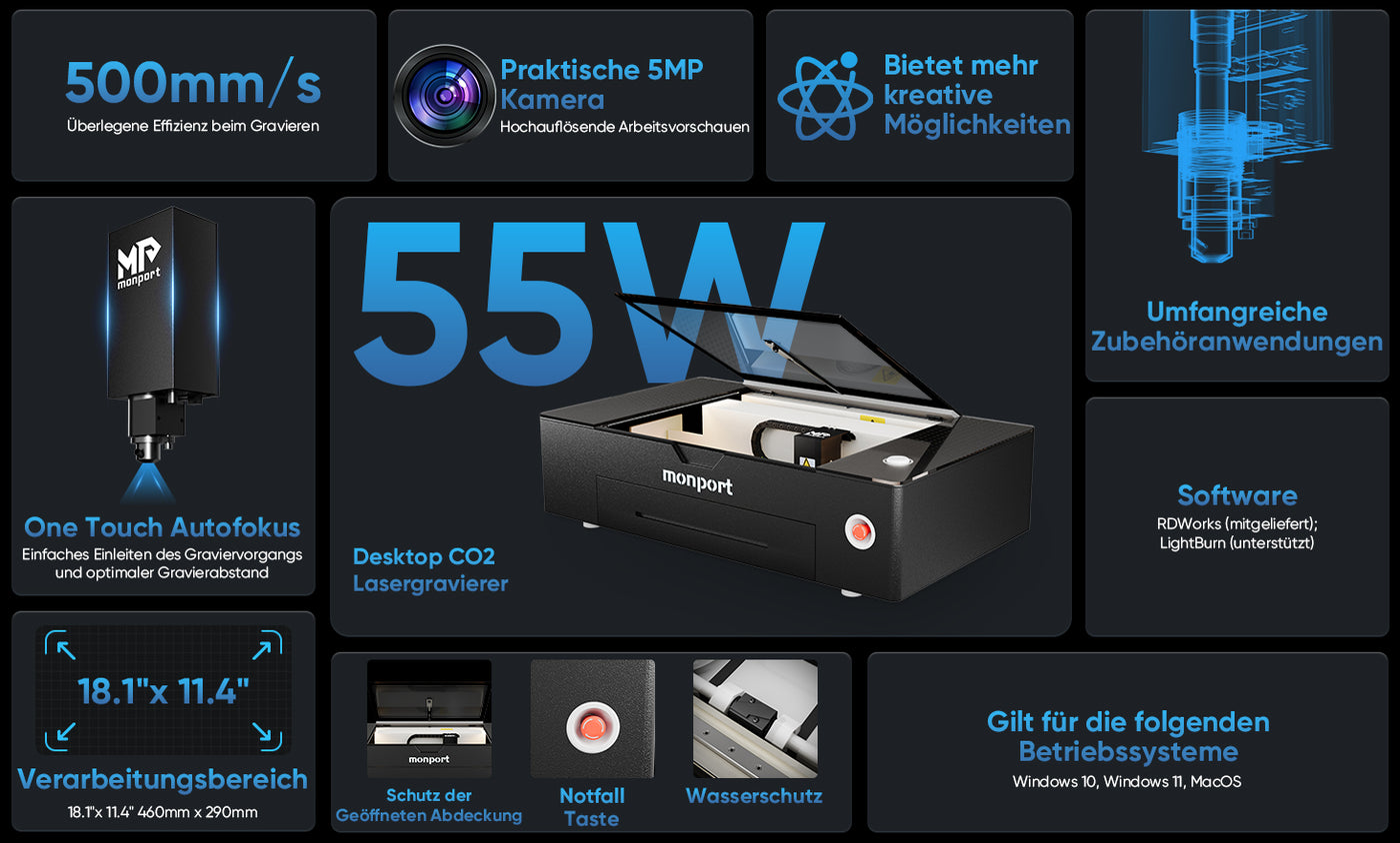 MONPORT ONYX 55W (460mm*290mm) Multifunktionale Desktop Laser Graviermaschine