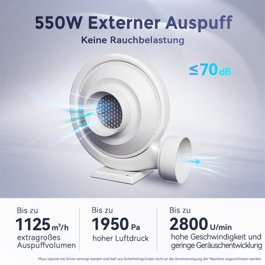 Um das durch die Verarbeitung verursachte Rauchproblem wirklich zu lösen, hat Monport das Abluftsystem der gesamten Produktreihe verbessert. Wir haben einen 550-W-Hochgeschwindigkeitslüfter mit einem maximalen Luftstrom von 1125 m³/h ≈ 660 cfm (mehr als das Dreifache des Abluftvolumens anderer Marken) verwendet und dabei eine hervorragende Geräuschentwicklung beibehalten.