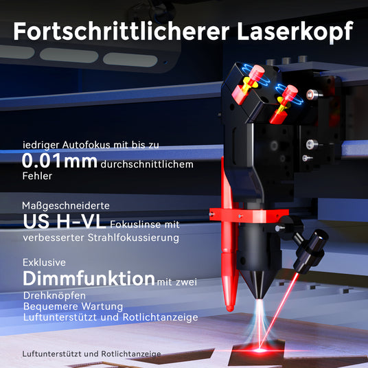 Mit umfassenden Schutzfunktionen, einschließlich Wasserschutz, Luftunterstützung, Temperaturalarmen, Abdeckungsschutz und einem Not-Aus-Schalter, können Sie beruhigt gravieren, da Sie wissen, dass Ihre Sicherheit immer an erster Stelle steht.