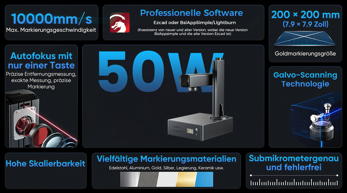 Unsere Lasermaschine ist kompatibel mit EzCad oder BslAppSimple (neue und alte Versionen existieren parallel, wobei die neue Version BslAppSimple und die alte Version EZcad ist) für Windows XP/7/10/11 (32-Bit und 64-Bit) und auch kompatibel mit LightBurn und anderen unterstützten Bildformaten: BMP, GIF, JPG, DXF, PNG usw.