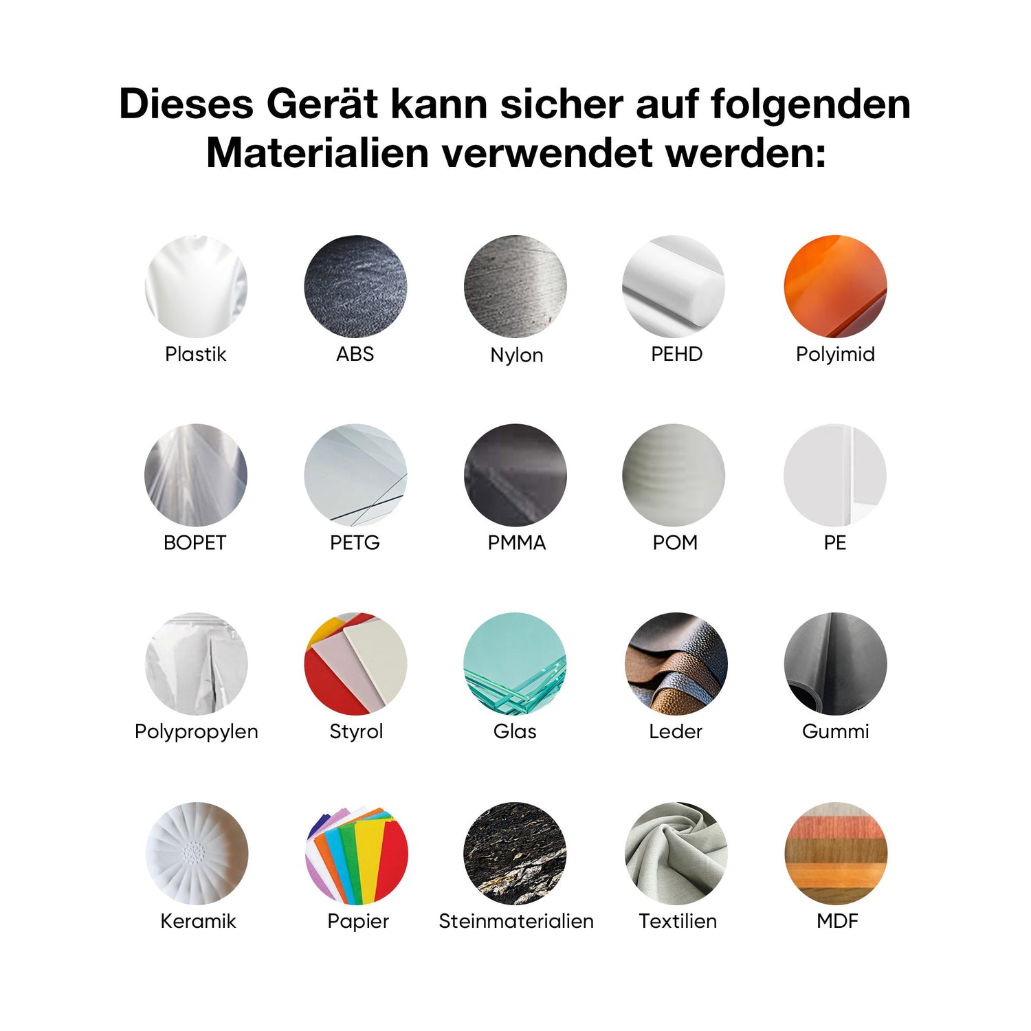 | Für die Gravur geeignete Materialien | Holz, Glas, Acryl, Stoff, Leder, Papier, Pappe, Gummi, etc. | Holz, Glas, Acryl, Stoff, Leder, Papier, Pappe, Gummi, etc. |