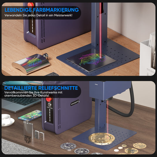 Diese Graviermaschine unterstützt Farbmarkierungen und hilft Ihnen, Muster mit besseren visuellen Effekten zu erstellen. Mit der Reliefgravurfunktion können Sie tiefe, komplizierte Muster auf kleine Gegenstände gravieren und so beeindruckende dreidimensionale Kunstwerke erstellen.