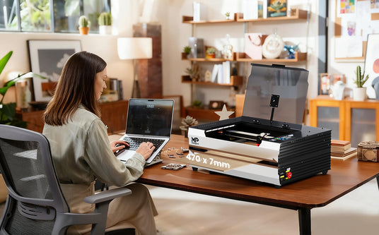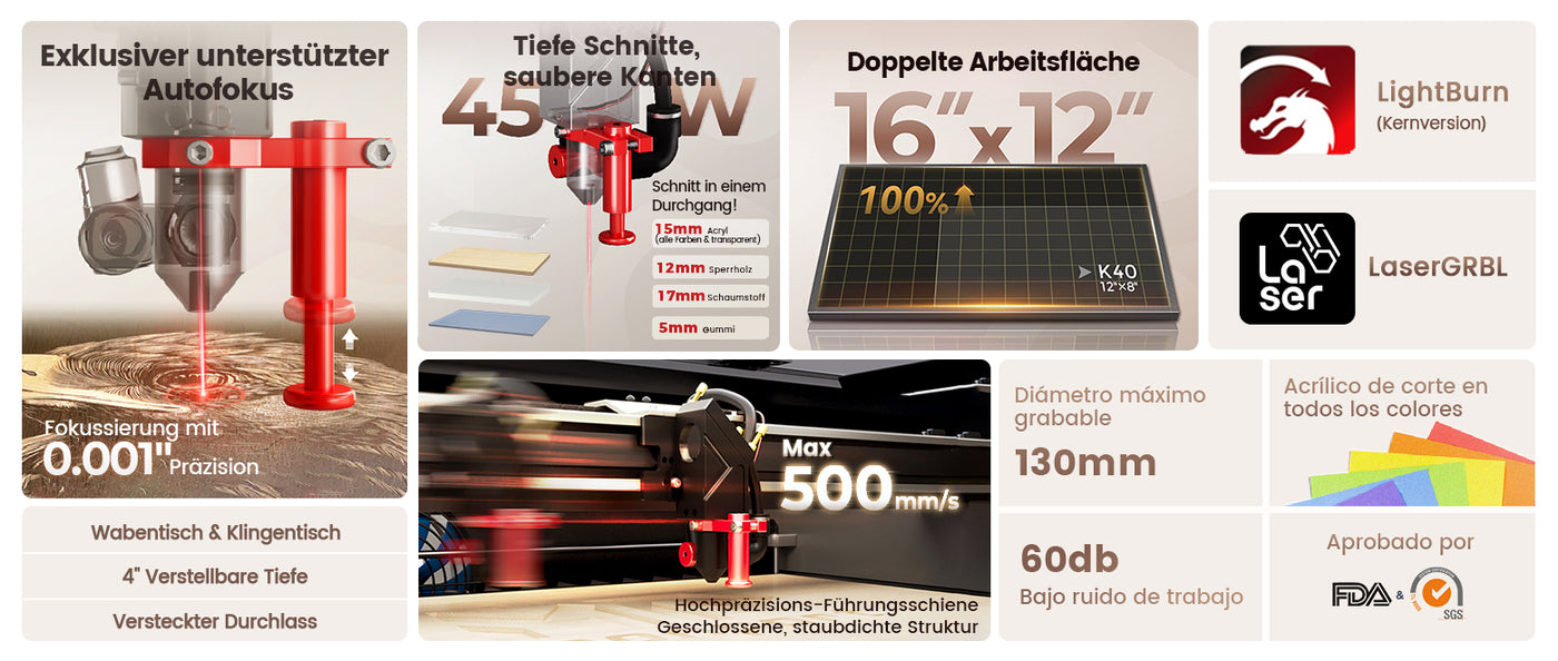 Dank seiner hervorragenden Geräuschdämmung arbeitet dieser Laser mit minimaler Geräuschentwicklung und eignet sich daher ideal für den Einsatz zu Hause oder im Büro. Die präzise rote Lichtanzeige ermöglicht eine genaue Ausrichtung Ihrer Projekte und verbessert die Präzision beim Gravieren und Schneiden. Ausgestattet mit einem leisen Luftunterstützungssystem, einem Abluftsystem und einer Wasserpumpe entfernt er effizient Rauch und Schmutz, ohne übermäßigen Lärm zu erzeugen, und trägt so zu einem ruhigen Arbeitsplatz bei.