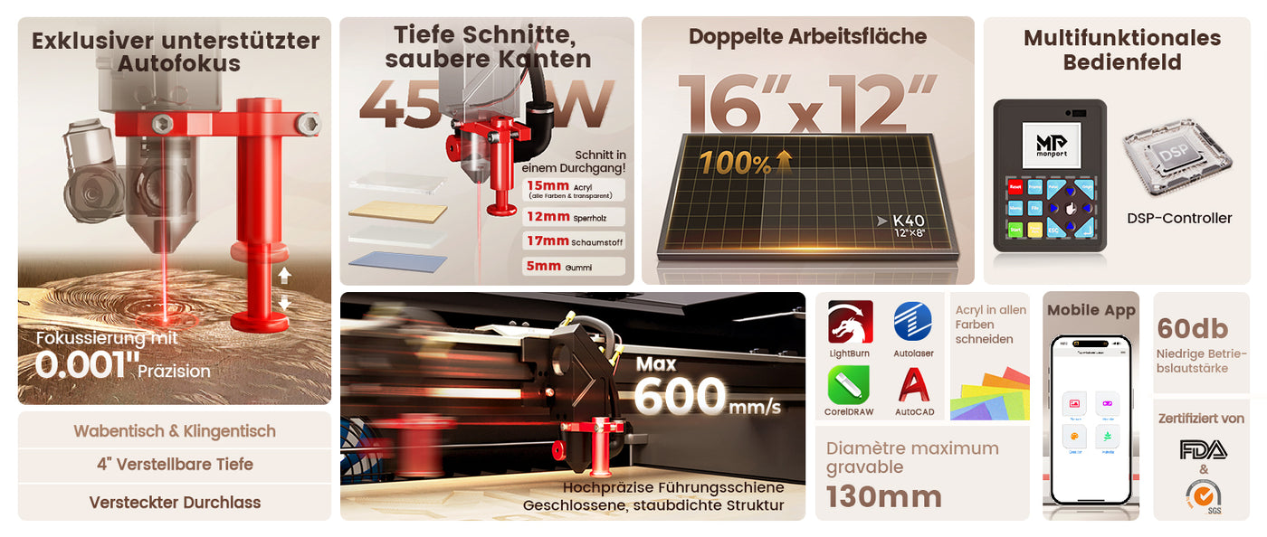 Dank seiner hervorragenden Geräuschdämmung arbeitet dieser Laser mit minimaler Geräuschentwicklung und eignet sich daher ideal für den Einsatz zu Hause oder im Büro. Die präzise rote Lichtanzeige ermöglicht eine genaue Ausrichtung Ihrer Projekte und verbessert die Präzision beim Gravieren und Schneiden. Ausgestattet mit einem leisen Luftunterstützungssystem, einem Abluftsystem und einer Wasserpumpe entfernt er effizient Rauch und Schmutz, ohne übermäßigen Lärm zu erzeugen, und trägt so zu einem ruhigen Arbeitsplatz bei.