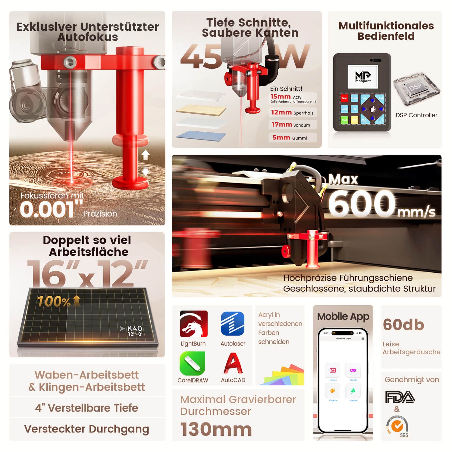 Monport Reno45 Pro 45W Desktop CO2-Lasergravierer und -schneider (16" x 12") mit brandneuem Assistierter Autofokus - Maschinen ist auf Lager und wird versandt, sobald es wieder verfügbar ist