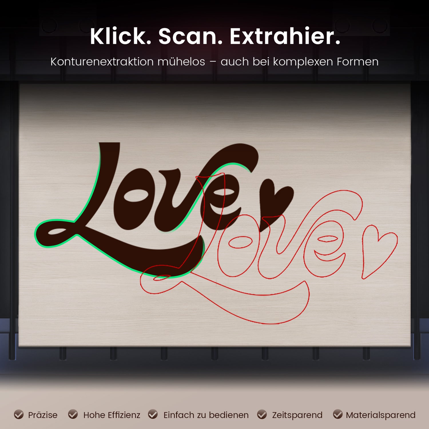 Die Kamera erkennt automatisch die Umrisse von Mustern und generiert Ränder. Dadurch entfallen manuelle Striche und Sie sparen Zeit und Material.